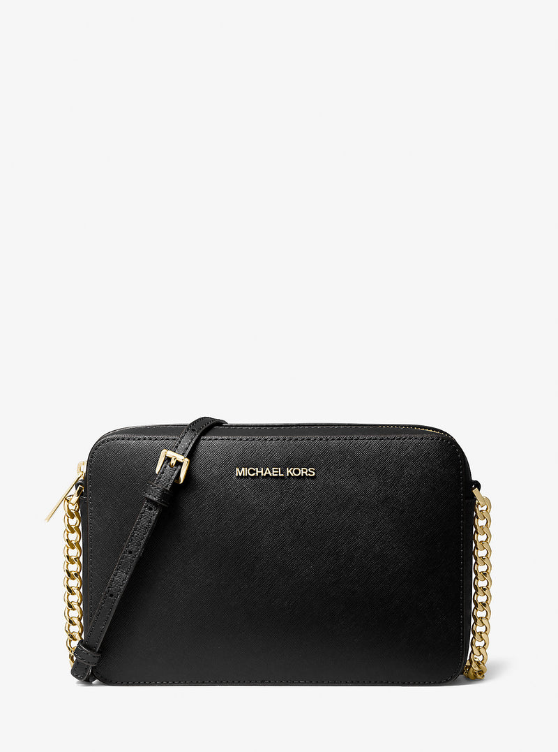 Structured in a clean-lined silhouette crafted from Saffiano leather, our Jet Set crossbody bag is an instant classic. Gold-tone hardware speaks to a luxe sensibility, while a spacious interior offers easy organization for your essentials. | • Crossbody bag